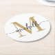 Girly Modern Simple Elegant White and Gold Monogram Initial Name Signature Script Custom Personalised Round Paper Coaster. This design featuring your first name in a pretty hand lettered style swash tail font typography (or calligraphy) with monogram initial in gold and black on white colour background. These are easy to customise it. Great stylish feminine housewarming gift, also for birthday, wedding, bridal shower, mother’s day, sweet 16 birthday party, baby shower, for graduation party and It’s for the girl who loves minimal unique stylish things.