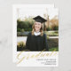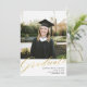 This photo graduation announcement features a modern calligraphy "graduate" greeting in faux gold foil with a white background. The backer is the same colour. This simple yet fun design really allows your photo to shine by keeping the details minimal while the greeting sets the festive tone. Tip: you can easily add more text or an additional photo to the back.