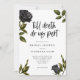 Gothic halloween theme bridal shower invitation card featuring illustration of black roses on a white background. The text says "till death do us part."