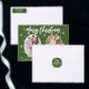 Modern Christmas card with snowflakes pattern on green background with artistic white script.