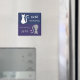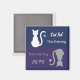 A reminder to feed the cat and let others know that the cat has been fed. Simply turn the magnet around when the cat has been fed in the morning or evening. The evening side has a white cat with a blue star hanging from their tail. The morning side has a grey cat with a pink star hanging from their tail. The background is blue and purple.