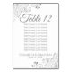 Make your wedding reception beautiful with these table number cards. They feature a simple yet elegant design with Grey text on a white background with a frilly silver faux foil floral border. These cards include seating assignments so your guests will have an easy time finding the right table.