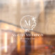Monogrammed window cling, perfect for an office door, with your initial inside a hand drawn floral wreath with leaves and berries. Add your name and title in white.