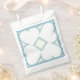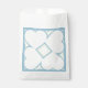 This favour bag features a pattern of four white hearts surrounding a central diamond outlined in grey on a light blue background - great for a bridal shower, christening, or wedding.