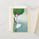 Print shows a white heron in the water next to a water lily plant and lotus flower.