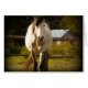 A beautiful full colour portrait photograph of a white horse. Fancy focus gives the added illusion of movement as it walks with grace and power across a rural field, with fencing and a barn structure in the background slightly out of focus. The tail and mane appear to be swaying in a calm afternoon breeze. Magical and uplifting, this image suits many occasions. Personalise any item with your own text to create a unique horse gift for the equestrian lover or horseback rider.