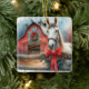 Pretty farming themed country personalised Christmas ornament. Pretty white watercolor horse with a red bow around her neck. Background is a red rustic barn all decked out in Christmas decorations.