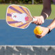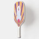 A cute white husky dog with a pink pickleball illustration with a purple and orange sunburst background is featured on this pickleball paddle. The dog is asking you to play and the back of the paddle/racket can be customised with your name to make it uniquely yours. A great gift for a dog lover and a pickleball enthusiast.