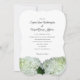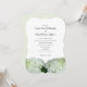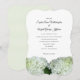 Pale green and white custom wedding invitation with big hydrangea flowers. The couple is inviting in this wording sample. Names are in script font with printed text for invitation text. Bracket shape is one choice, with other paper upgrades available.