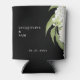 Black background with White Hydrangeas Wedding favour can cooler. White typography. Modern Design and font. Elegant. Black and white.