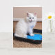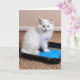 A cute white kitten with blue paint splatters on its fur sitting in a paint tray thank you for friend.
