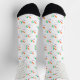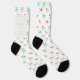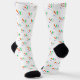 White knee-high socks with black heels and toes feature a colorful confetti pattern of small triangles and stripes. The design creates a playful, vibrant look.