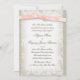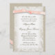 Old fashioned rustic country elegance, vintage inspired with romantic white lace and blush pink bow over a light tone burlap look. All parts of this invitation are printed. There is no real burlap, lace or ribbon attached.