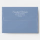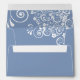 This beautiful wedding envelope is features a dusty blue or periwinkle coloured background with white floral curls and swirls on the inside flap. There is a printed return address on the back flap in fancy script lettering. The design is understated and simple, yet classic, chic and ornate. Perfect way to make your wedding invitations all the more special.