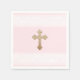 Girly pink religious cross paper napkins- Solid pink background with faux gold metallic cross in the centre. Pink background colour may be changed to any colour. Bordered at top and bottom with faux floral white lace. Note: All images are printed. Not actual lace or metallic. Lovely religious paper napkins perfect for baptisms, communions, dedications, and Easter. Coordinating pink baptism invitations and other religious napkin styles are in our Zazzle.com/angela65 store.