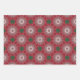 Set of three wrapping paper sheets with different decorative patterns in matching colours. Each sheet features a seamless festive pattern made of white lace snowflake ornaments on a dark red mosaic geometric background.
