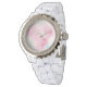 An elegant wrist watch featuring delicate painted white lace against a watercolored visual plane.