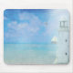 White lighthouse with seagulls and sailboat in a watercolor effect.