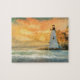 Puzzle with a beautiful white lighthouse, sitting on the coastline, with a brilliant sunrise / sunset in the background. Make it your own by adding text.