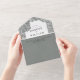 All in one tri- fold wedding invitation featuring white line art flowers on a sage green/ grey background. Wedding invitation, rsvp card and envelope combination.