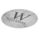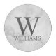 features personalised monogram and name in grey classic serif font style on white marble background.