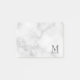 features personalised monogram and name in grey classic serif font style on white marble background.