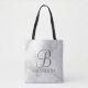 features personalised monogram in grey classic script font style and name in grey classic serif font style on white marble background.
