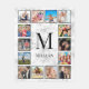Create your own personalised 12 photo collage fleece blanket with your custom images, monogram and name on a stylish elegant white marble background.