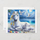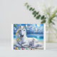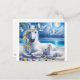 A white mare and foal laying on the beach under the moonlight. Colourful shells and white Owls surround them. Printed on a Postcard.