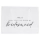 Show your appreciation with this elegant, personalised gift bag. Each bag features your bridesmaid’s name in a sophisticated font and the heartfelt message, "Thank you for being my bridesmaid," in beautiful calligraphy. Perfect for holding all your thank-you gifts, it’s a stylish and memorable way to say thank you to the special women by your side.
