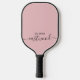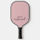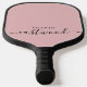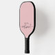 A modern minimalist monogrammed pickleball paddle design featuring a white script and sans serif typography, on a pink background.