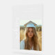 Welcome guests to your grad party with an elegant clear acrylic sign with white text and photo. "Welcome" appears at the side in modern script calligraphy. Personalise the template with your photo, event title, class year, and school. © Kimbellished, LLC