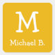 Rounded square sticker with white name and monogram on honey mustard yellow with inset white rounded square trim.