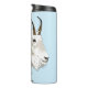A side profile portrait of a white mountain goat. Wild flowers all around the mountain goat all drawn in a tattoo style in a backdrop of blue