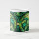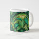 White mug featuring a vibrant, intricate pattern of green tropical leaves with black curves and geometric shapes, evoking a lush, natural feel.