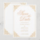 Nikah Islamic White Gold Save The Date card. This is a vintage baroque style announcement for Muslim couples that can be used for their Mehndi and Walima ceremonies. You can customise the colour, type and size of the fonts by using Zazzle's easy-to-use menu. You can edit all the information that is written. Paper type can be changed by you. Check out other products in this vintage faux gold collection by visiting HerLineForDesign store on this website.
