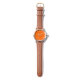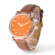 Men's Rose Gold Vintage Watch with Brown Leather Strap, featuring bold white Arabic numerals against a neon orange background. This watch is customisable with your own text or images. The vibrant colour is often associated with the Leo zodiac sign, making it a thoughtful gift choice for him.
