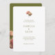 Modern and trendy with vintage feel. This lovely wedding invitation features a bouquet of voluptuous rose accents against chic white and olive green backgrounds. The set of contemporary fonts exude a stylish modern elegance. Personalise with wedding website and RSVP detail at the back.