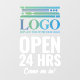 Open 24 hrs window cling for your small business personalised with your business logo. At the bottom, come on in in a retro script. Open is written in large bold white letters with 24 hrs beneath.