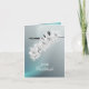 Personalised wedding photo note card with delicate and elegant design featuring an exotic white orchid blossom on silky teal blue background.