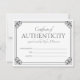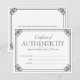Elegant certificate of authenticity flat card in dark grey and white to which you can add your name or business name inside an ornate vintage-inspired frame. White certificate of authenticity flat card with elegant frames and fonts.