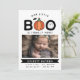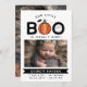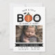 Announce your Halloween baby with this cute pumpkin themed baby announcement card in white with Our little Boo is finally here written at the top. A pumpkin replaces one O and a ghost dances in the other O. Add your baby's name in white on a black label.