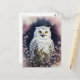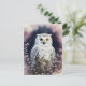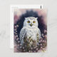 Postcard features a white owl with black marks framed by flowering plants against a night sky. A cool colour scheme of midnight blue, and mauve combined with botanical floral elements and a creepy bird with yellow eyes.
