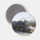Old-fashioned train travelling through the White Pass to Skagway, British Columbia with a snow covered mountain in the background. Reprinted on this magnet.