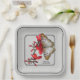 This is close-up, nature photography of a white peacock butterfly on red flowers. The photo was cut out and placed on a frame of black squares.