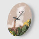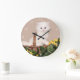 White persian kitten in a wicker basket with flowers surrounding surveying her world cat lovers wall clock. Background is beige, numbers can be removed