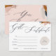 Elegant gift certificate in white & blush pink colours featuring your business contacts, white handwritten script calligraphy along with a place for your contacts and customisable sections about gift. Matching items available.