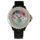 Elegant floral watch,white pink white roses and purple blue anemones on teal background with printed pink gemstones.