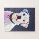 My original artwork is featured on this dog puzzle, consisting of a blue retro background and a white pit bull dog in a graphic illustrated style portrait, processed from my original photograph. The size of this art puzzle is 11 inches by 14 inches; however, you can size up or down as you please. These puzzles are well made of sturdy cardboard mounted on chipboard. They are printed in vivid colours and come in a custom gift box with the image design printed on top! Made in the U.S.A. and these make great gifts for children and adults.