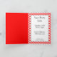 A custom folded party invitation with italic and block letters on white polka-dots on a red background. Or customise this design to change fonts, sizing, add or remove text and more.